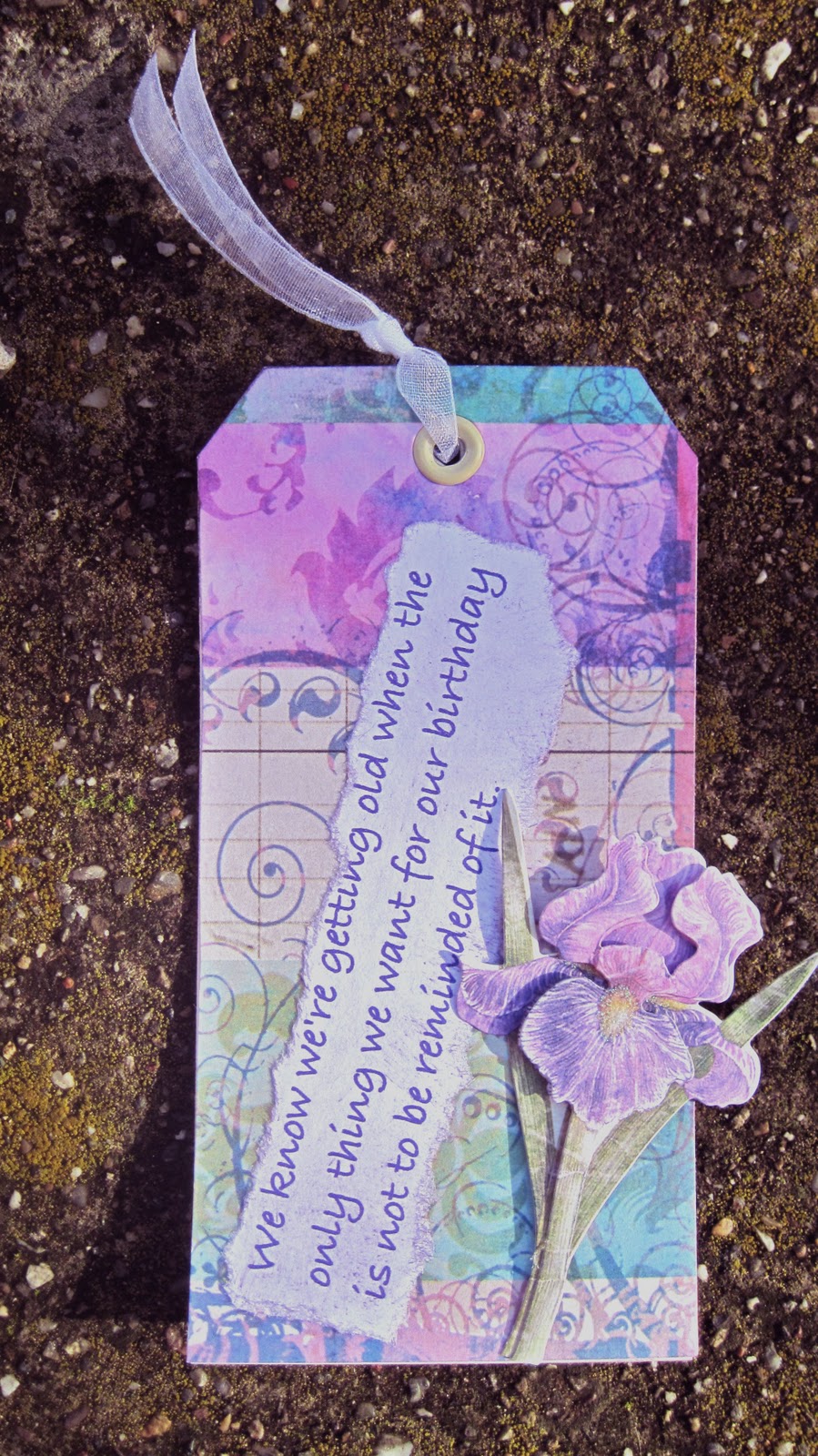 Tie a length of ribbon through the eyelet. - Randomly stamp the tags with the iris stamp or with the script stamp as desired.